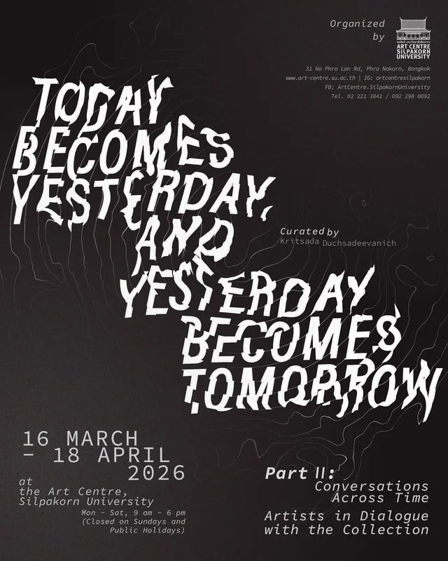Truth is transient, and art functions in a similar way. The exhibition "Today becomes yesterday, and yesterday becomes tomorrow" draws on works from the Silpakorn University Art Collections to explore and generate dialogues about truth across multiple dimensions. The atmosphere of change creates a distinct space where viewers can pause, reflect on the unfolding realities around them, and open a conceptual space to consider the passage of time and truths that are gradually fading. The rapid pace of the contemporary world can cause us to overlook or ignore the stories around us, including the state of the mind. Social histories that have passed through time may exist only as sediments of experience, rather than solidified crystallizations. These sediments continue to move, forming faint dust from the past, circulating through artistic expression, and shaping the creation and perception of contemporary art in the present.